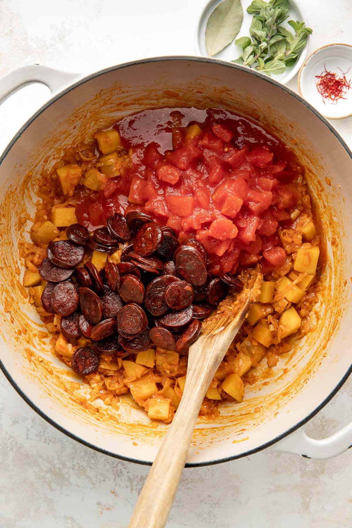 - Build the broth. Stir in the diced tomatoes, then return the chorizo (plus any accumulated juices) to the pot. Add the fish stock (or broth/clam juice), saffron threads, oregano sprigs, and bay leaf. Bring to a boil over medium-high heat, then reduce to a lively simmer and cook until the broth is flavorful and slightly reduced, 4-5 minutes.